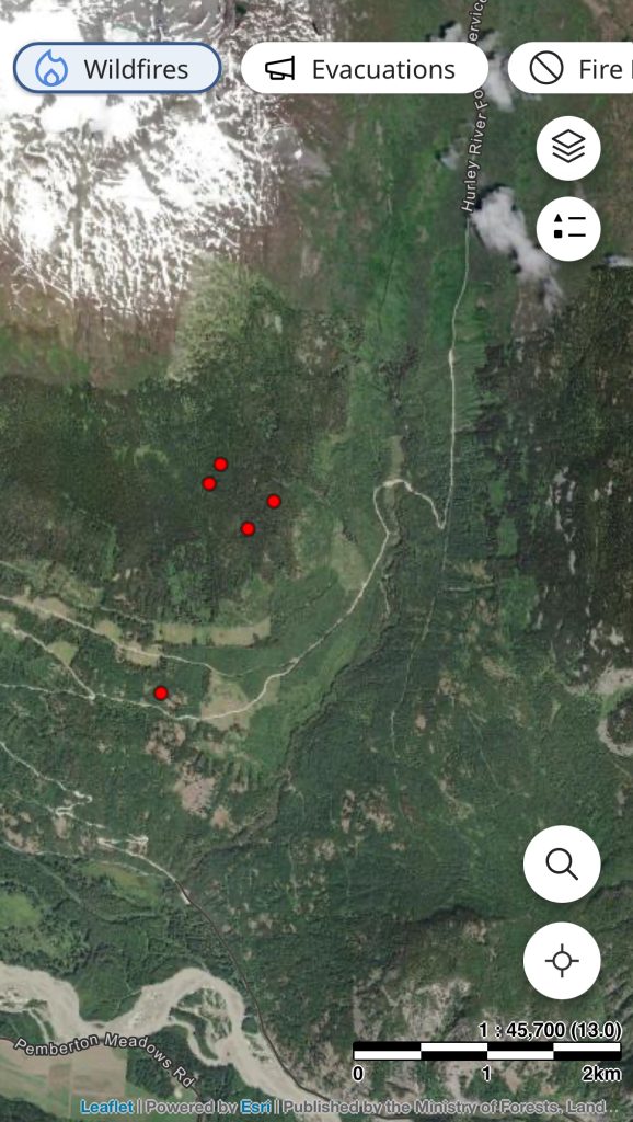 There are currently 5 spot fires on the Pemberton side of the Hurley. One is burning between switchbacks and the other 4 are above the switchbacks. If the road closes we will advise as soon as we find out.